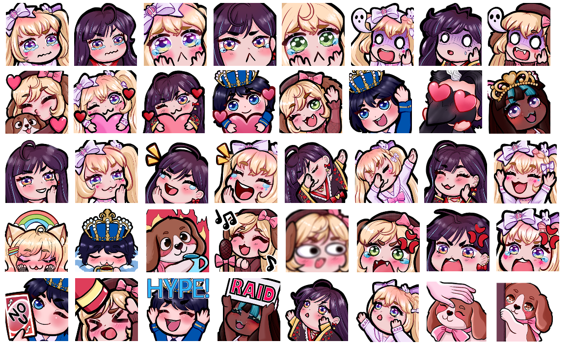 - You will get 500x500px emotes and HQ illustrations. You can do anything with them but can't sell or use as merch.